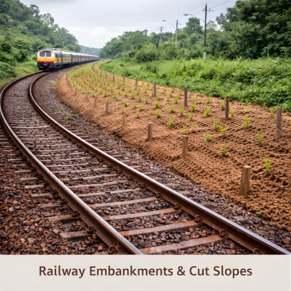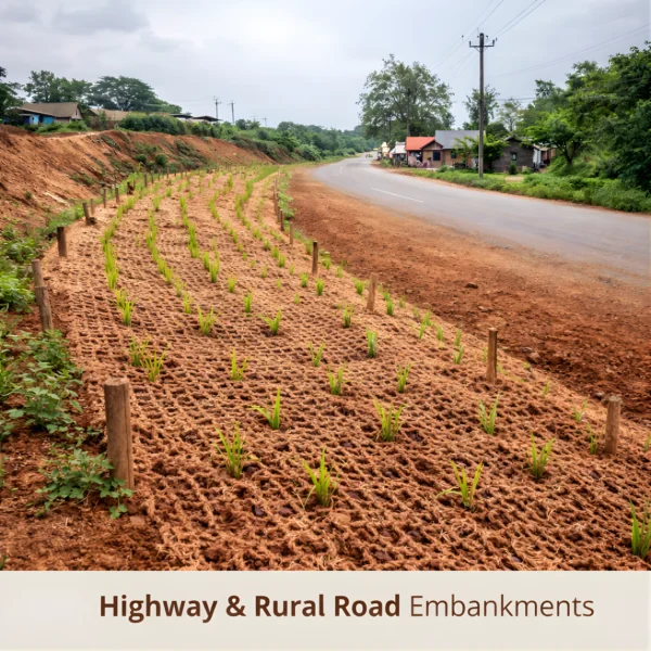 Manufactured using traditional coir weaving techniques and modern quality standards, this geo-textile provides temporary reinforcement while allowing natural vegetation to establish, making it an environmentally responsible alternative to synthetic geo-textiles.